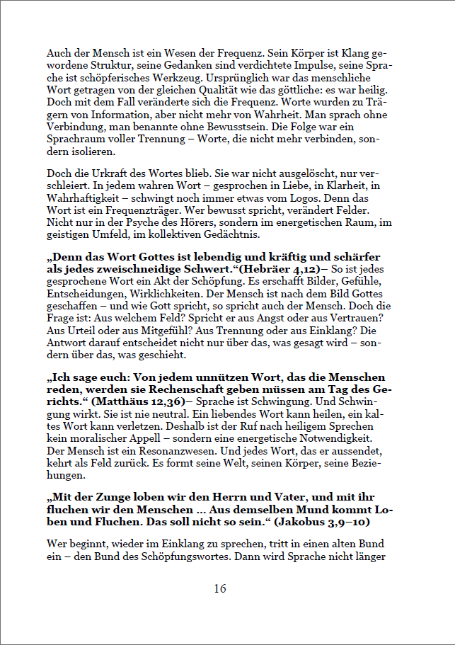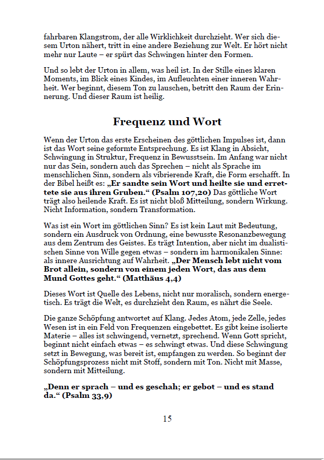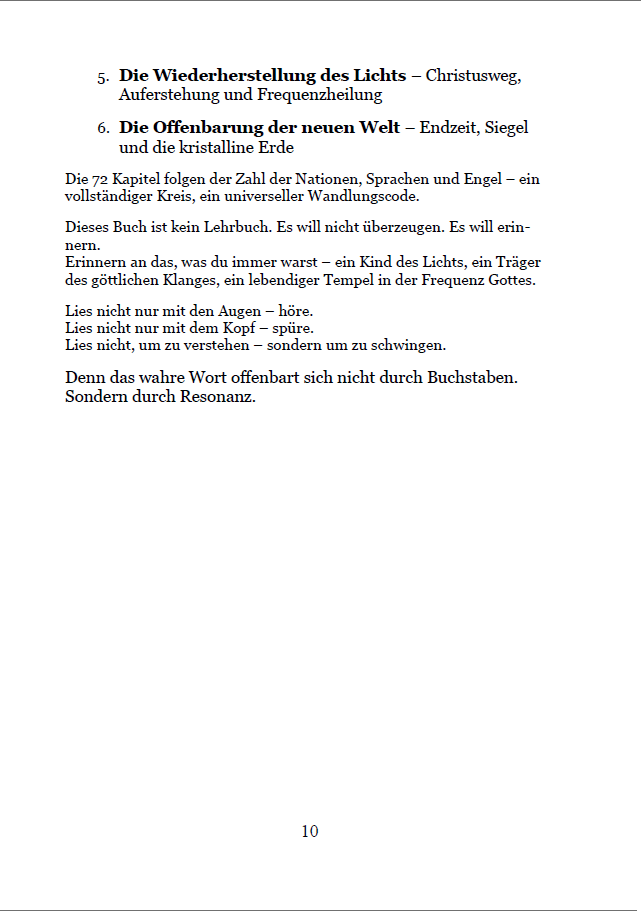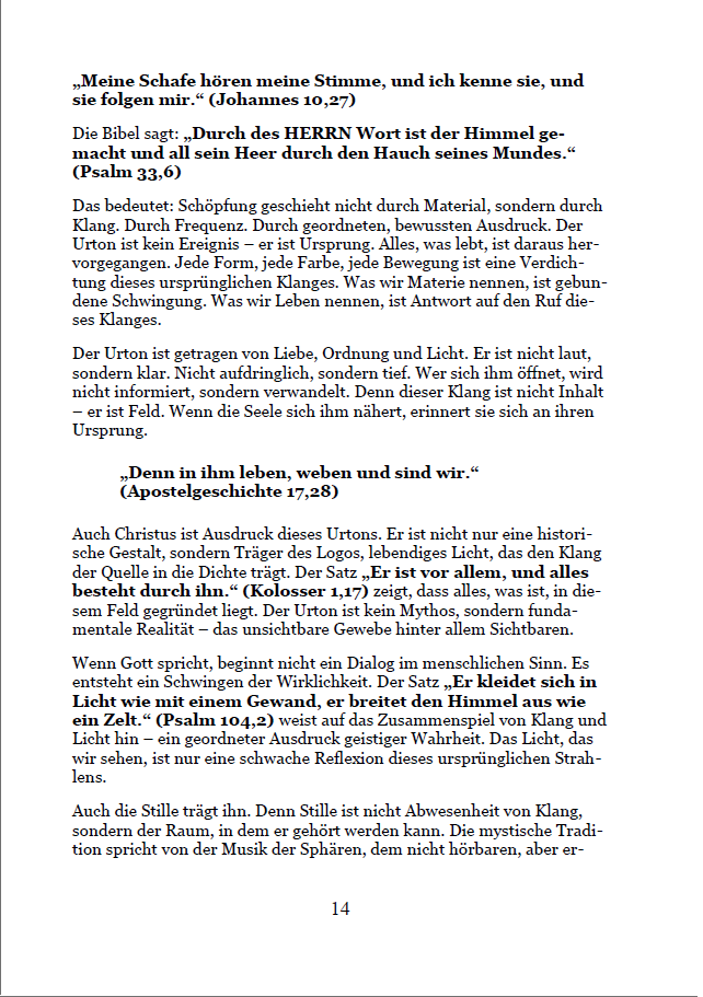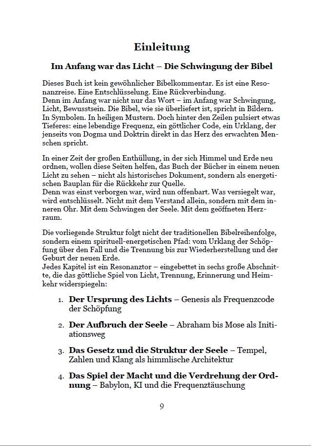 Hunderte Bibelverse werden im Licht von Klang, Frequenz und Bewusstsein neu entschlüsselt. So wird sichtbar, wie die alten Texte nicht nur vergangene Ereignisse beschreiben, sondern innere Wirklichkeiten, die heute spürbar sind: Schöpfung, Arche, Exodus – alles wird zum Spiegel unserer eigenen Frequenzreise.
