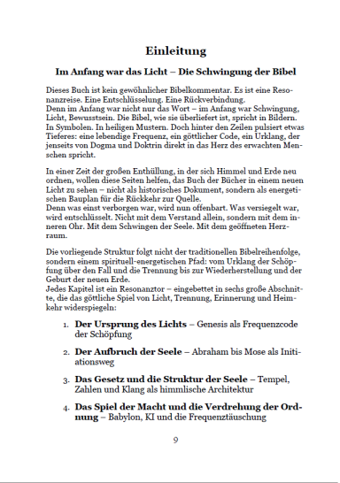 Dieses Buch eröffnet den ersten Teil der Bibel-Frequenzübersetzung. Von der Genesis bis zu Mose wird die Schrift nicht als starre Geschichte gelesen, sondern als lebendiges Resonanzfeld.