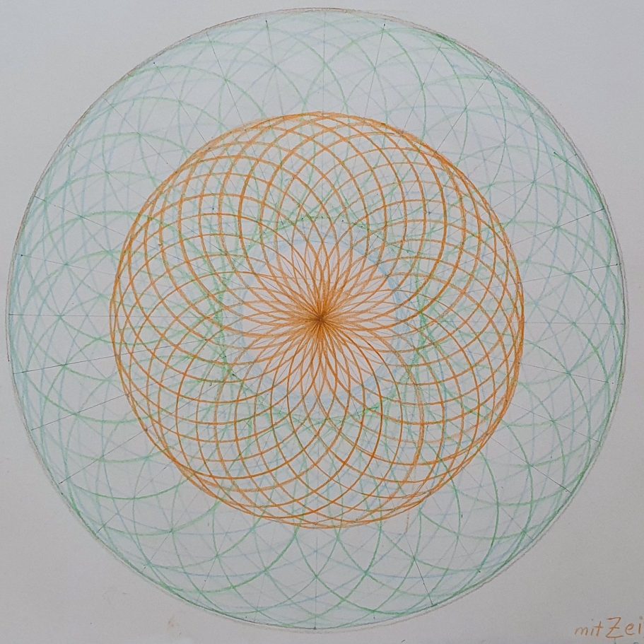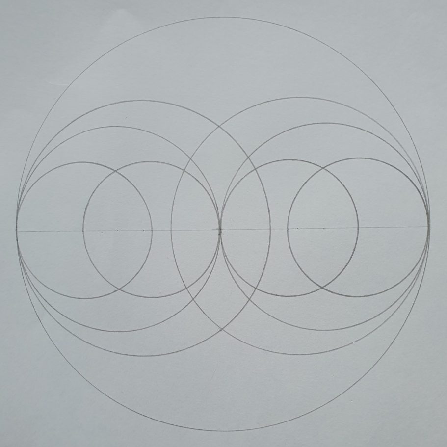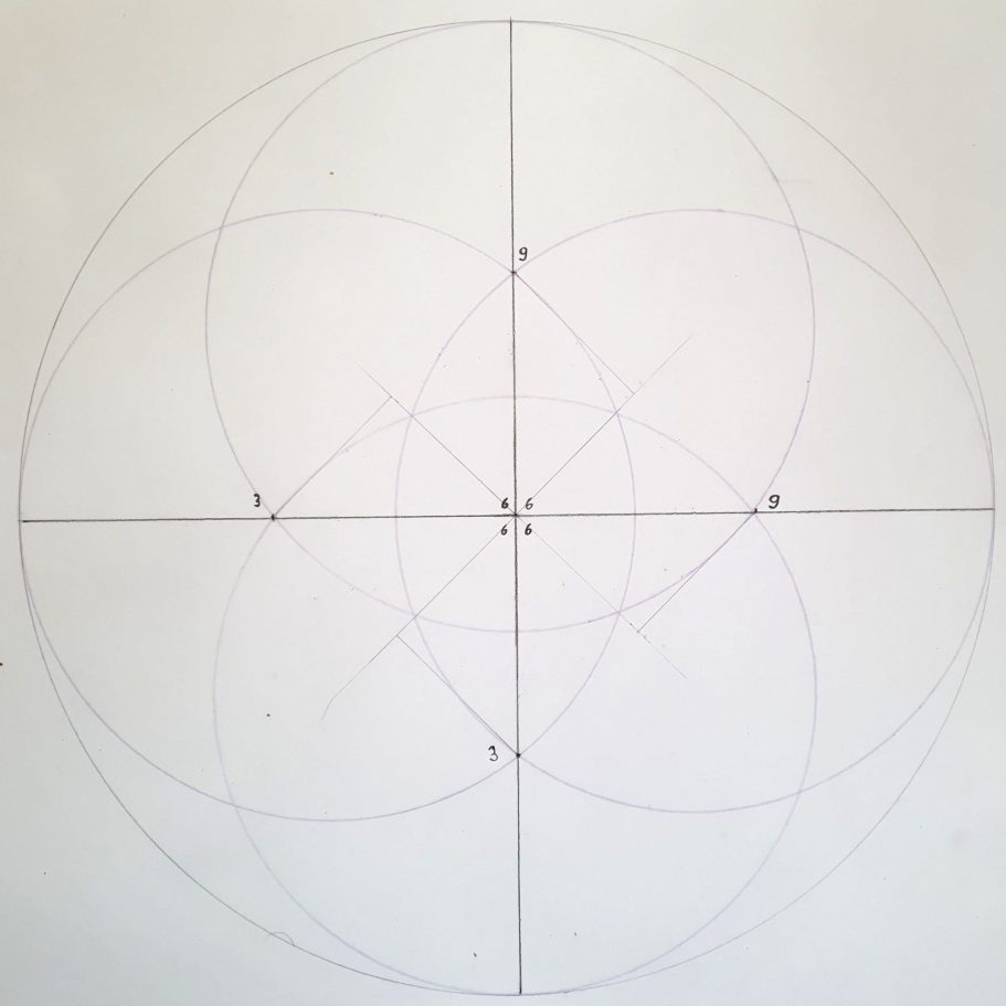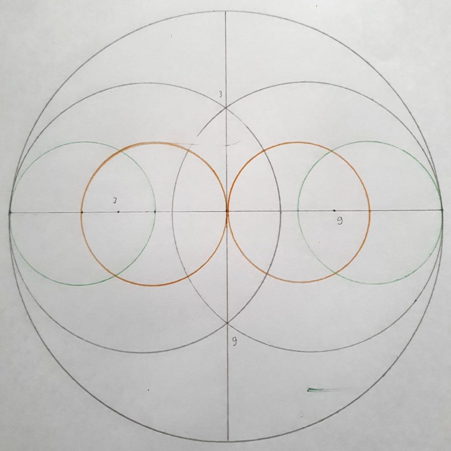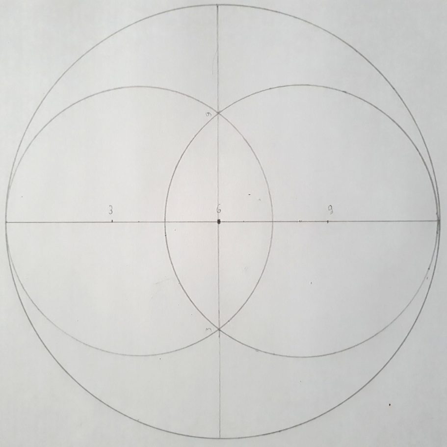 Abbildung 7: Vesica Piscis bilden sich über Fixpuinkt 0 der Zentrumsachse und Fixpunkt 3 und 9 der diagonal liegenden Achse.