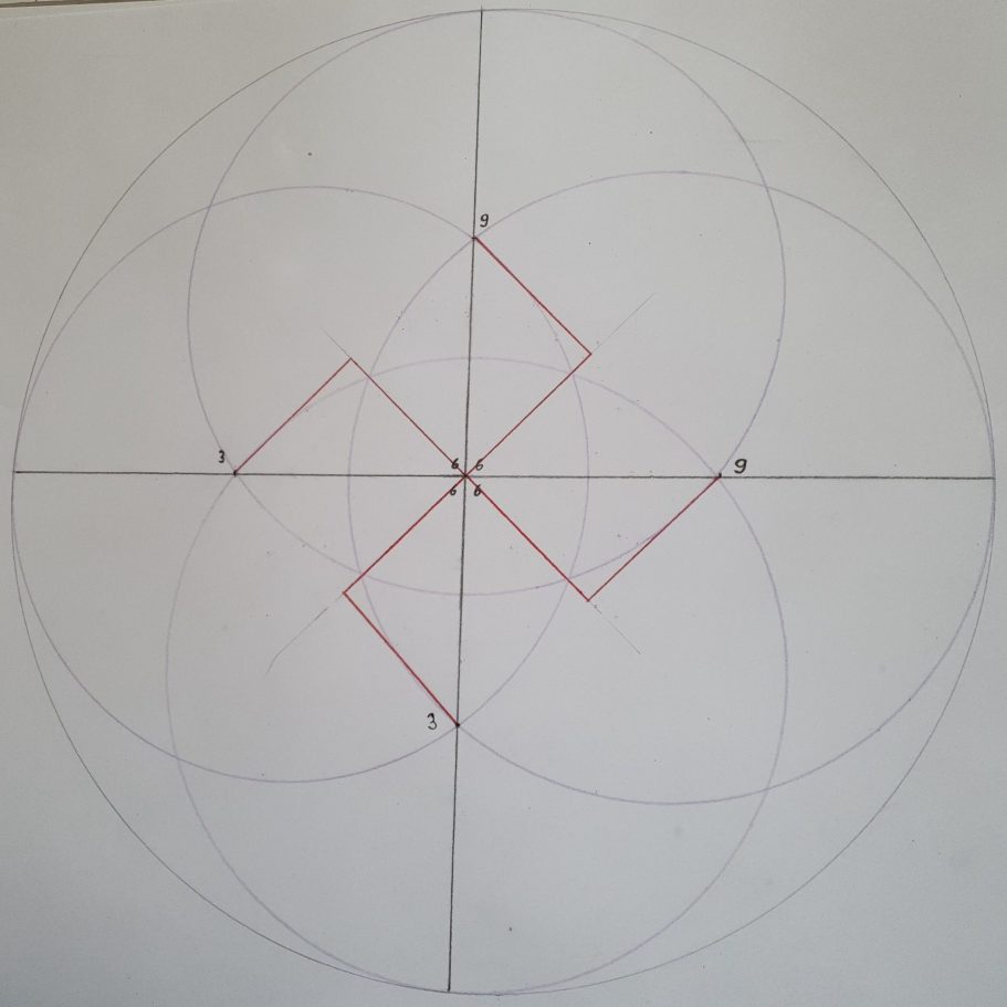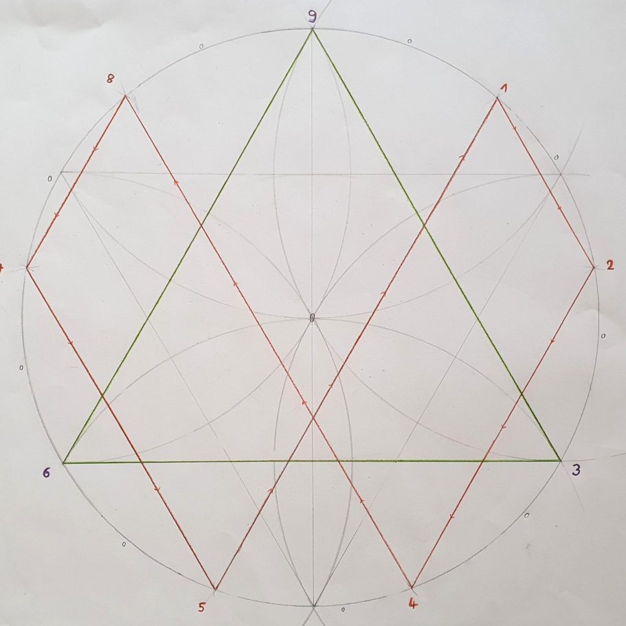 Die im Modell zentralen Zahlen 3, 6 und 9 erscheinen in der Geometrie nicht als Anfang, Ende oder Entwicklungsstufen. Sie sind auch keine hierarchischen Markierungen. Sie treten ausschließlich als Umschalt- und Fixpunkte innerhalb eines übergeordneten 0-Rahmens auf, der den gesamten geometrischen Durchlauf umfasst.