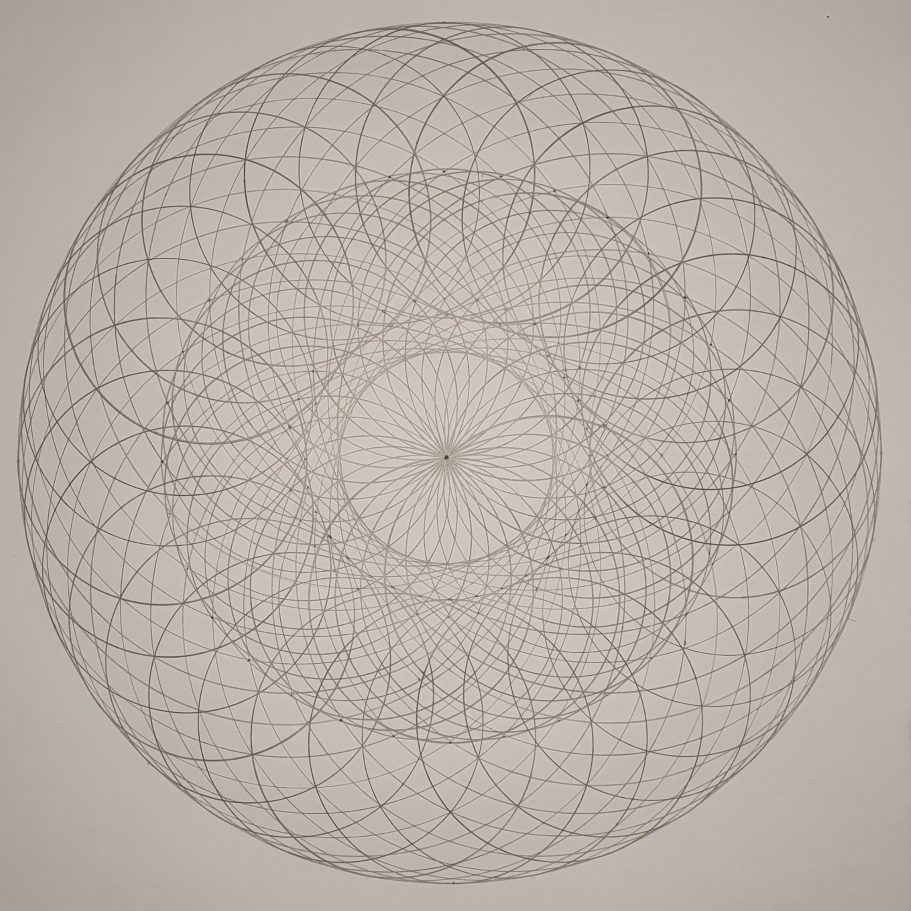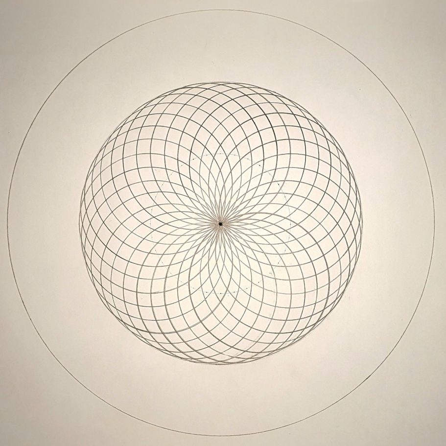Abbildung 1 zeigt das Vesica-Piscis-Netz auf einer 32-Achsenstruktur. Die dargestellte Form entsteht durch die Überlagerung vieler einzelner Vesicae, wobei die Achsen selbst nicht explizit eingezeichnet sind. Sichtbar wird ein dichtes Netz systemischer Schnittstellen, das den Raum strukturiert, ohne ihn zu füllen. Das Zentrum bleibt bewusst offen; es wird nicht durch Vesica-Strukturen besetzt.